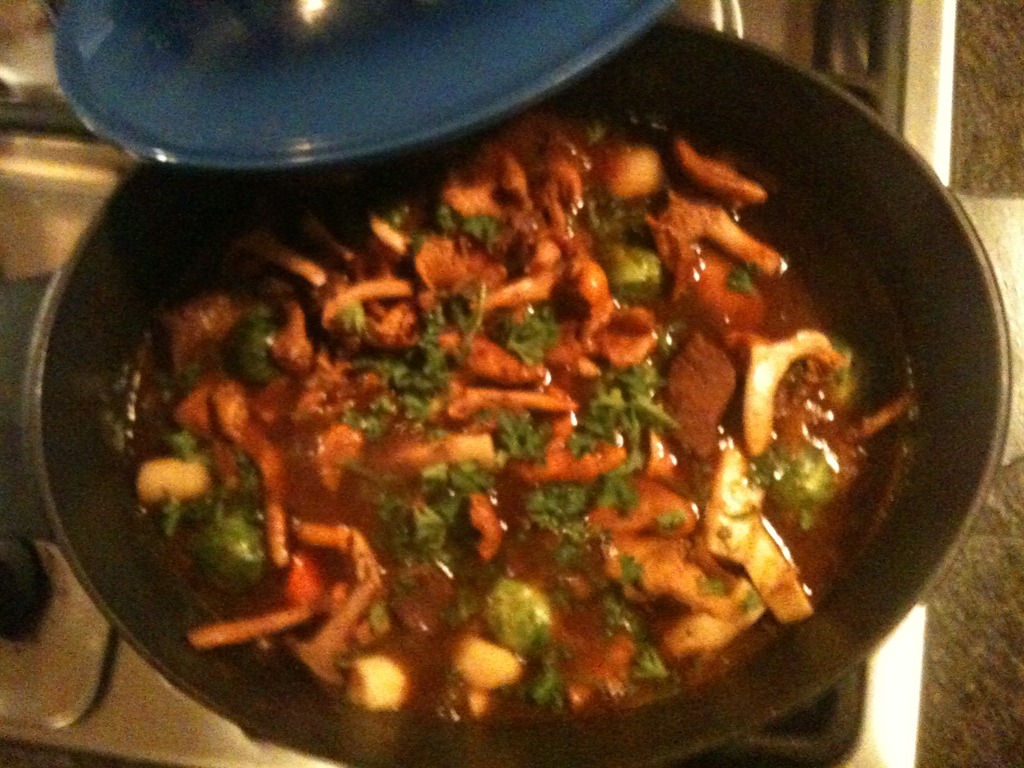 Nötkött, buljongtärning, rödvin, vatten, lök, purjolök, tomatpure, persilja, timjan, lagerblad, palsternacka, rotselleri, morötter, kantareller och så några färska brysselkål hittade jag i kylen. En finfin gryta som kokat i snart två timmar och som kommer att serveras med ris och haricot verts och självklart nybakat bröd och god morbier och brie. Jag rekommenderar starkt att dricka upp vinet som blev över efter grytan.