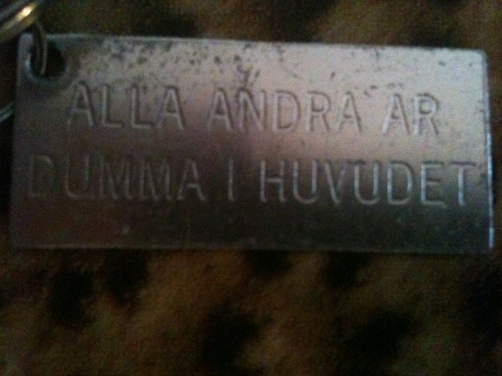 Barnen ger mig då och då presenter. Ofta klurar de, shoppar i timmar och hittar på riktigt bra saker. Designtorget är deras absoluta favoritställe att handla på när vi är i Sverige. I somras hade vi som vanligt bröllopsdag och de två yngre blev nedskjutsade till gågatan av mormor och morfar med en slant i fickan. De handlade och vandrade och kom hem med de mest perfekta presenterna tyckte de själva. De hoppade upp och ner medan vi öppnade det omsorgsfullt inslagna paketen. Till en början fick vi varsinn uppfällbar kaffemugg, vi gillar ju kaffe. Sedan kom fnissen… varsinn nyckelring med väl valda ord på. Brjanns ord skriver jag inte här på bloggen eftersom den är barntillåten. Min nyckelring tyckte de var mer än perfekt för mig, den var som gjord för mig, endast för mig, och ingen annan. Nu bär jag med mig denna på mina bilnycklar och tittar på den varje dag.