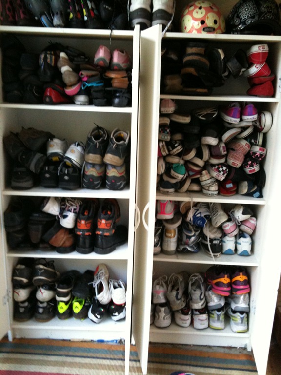 Jag har alltid gillat skor. Jag drömmer om när jag får åka hem till Uppsala på sommaren och inhandla en rejäl kasse med skor hos Stefan på Bamå på Skolgatan i Uppsala. Sedan vi flyttade hit har skobehovet ändrats och antal schyssta skor i garderoben har kraftigt minskat. Jag har blivit en äkta amerikansk hemmafru som skuttar runt i jogginskor mest hela tiden. Läskigt. Antalet joggingskor har ökat för hela familjen och för att inte tala om antal Vans och All Stars. Idag fick barnen i uppdrag att slänga alla skor de hade vuxit ur eller inte använde och sedan ställa in allt fint i skoskåpen i garaget. Så här blev resultatet i gympadojjs skåpet. Flip Flop skåpet är inte med på bild och min skogarderob fastnar inte på kort. Stackars barn, jag tror vi måste gå och skoshoppa!