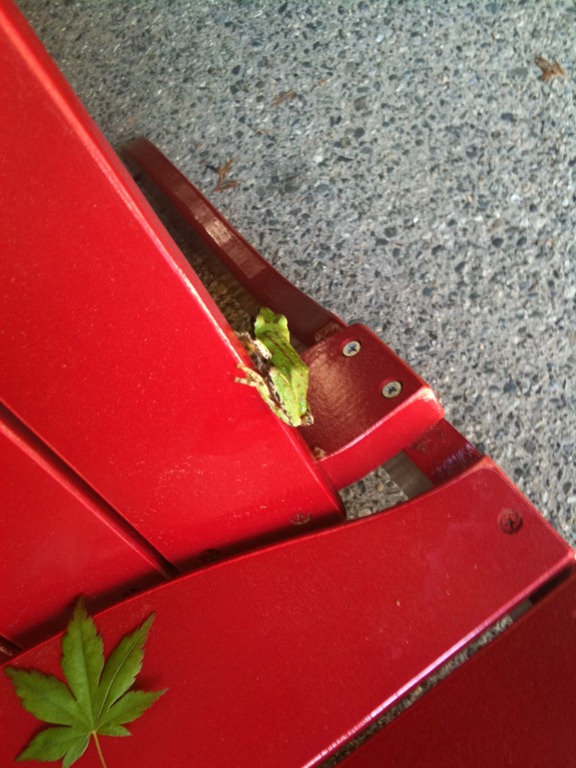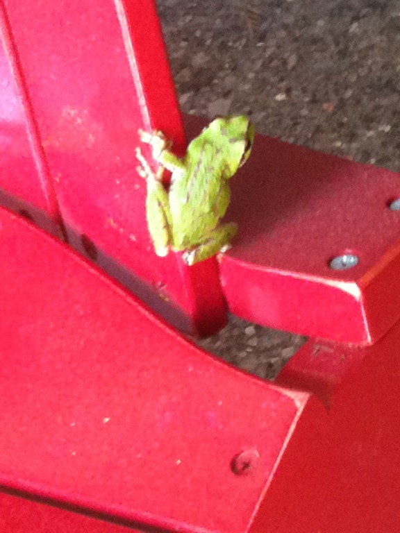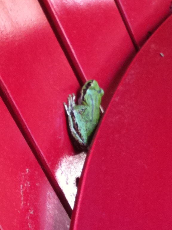 Här sitter vi och lapar sol på trappan och känner fräknarna gro. C lyfter på filten för att släta till den och vad får vi se… en groda stor som en knytnäve. Efter några fjantiga tonårsskrik och hopp på plats (inte av mig) petar jag på grodan, den sitter ju i min stol. Den hade fastnat med ryggen mellan brädorna. Nu hoppar den fritt igen och har skuttat ner från trappan in bland buskarna.