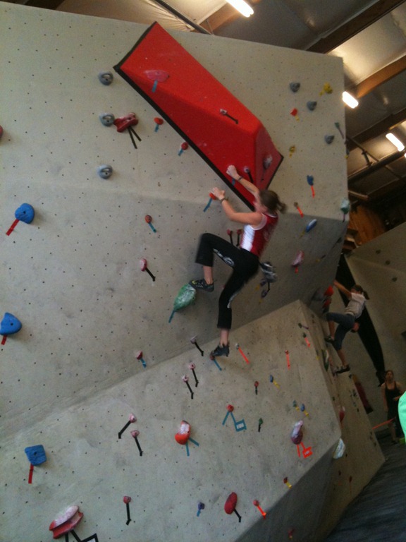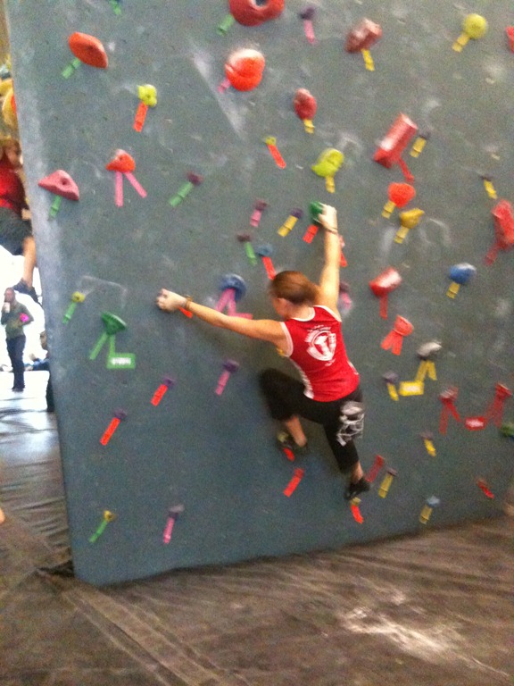 Klockan ringde 05.15 imorse och det var bara att blinka bort sömnen och sträcka på kroppen. En timme senare satt Caroline och jag i bilen på väg in mot stan, nyätna och laddade för tävling. Det var kolsvart och tomt på andra bilar. Vi konstaterade att det var en bra lördag, vi hade kort att köra. Det hade kunnat vara södra Oregon eller Tacoma och nu var det bara över bron förbi Mercer Island och in till Seattle. Det här klättringsgymmet ligger i en något tveksam del av stan där man inte gärna tar en promenad när mörkret har lagt sig. Det var mängder av bilar placerade längs gatorna med sovande människor i. Och värre var att det var gott om kartonghus där kylan börjar krypa in på nätterna.