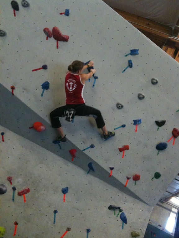 Vi var på plats tidigt och hann med registrering och prat innan det blev kaos. Caroline har inte klättrat på länge. Hennes brutna tå har spökat sedan i juni så det var med stor förväntan klättrerskan spände på sig skorna och kalkade händerna. Det gick bra, enbart glada miner och positiva utrop. Viktigast var inte att vinna eller placera sig bra idag utan få klättra tillsammans med sina kompisar.