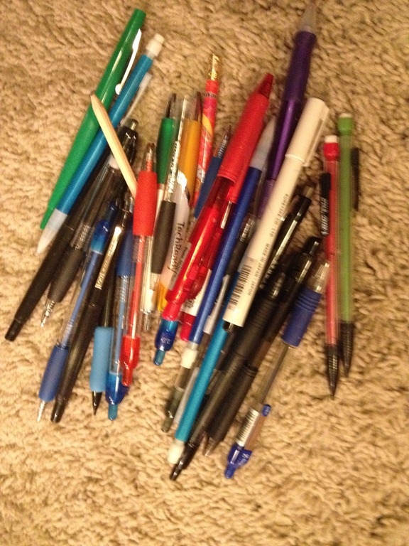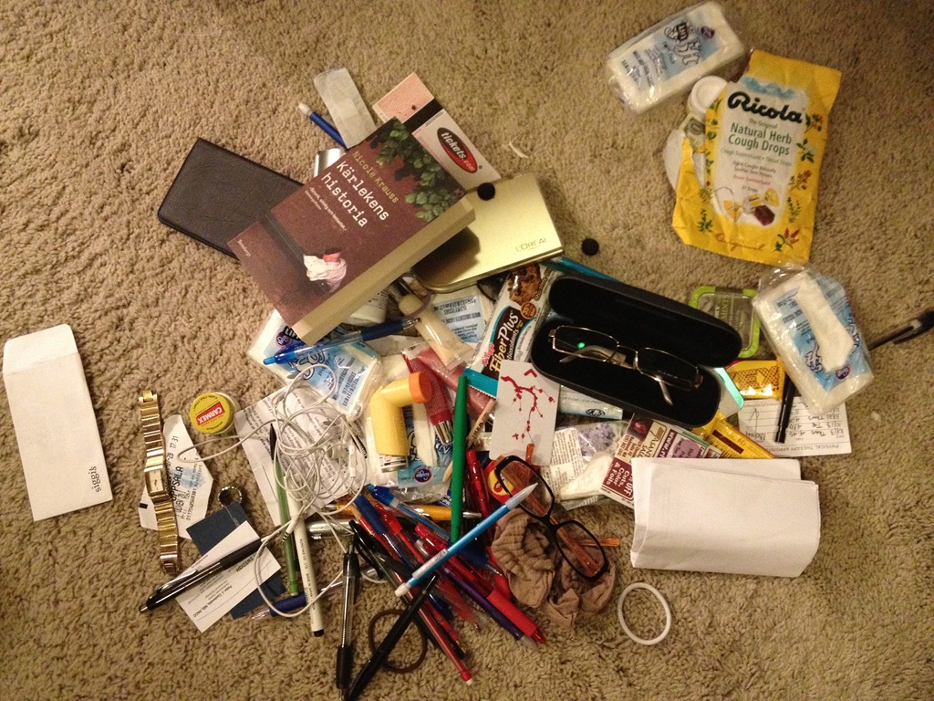 Jag hade också +40 pennor av olika färger och kvaliteter. Och det verkar som om jag är lite rädd för att bli narig om lilla läppen. Men till min stora besvikelse hittade jag nästan inga pengar, endast $1, 78 och 2 svenska kronor. Ynkligt. Det som inte hamnade på bild var en stor mängd bars (jag äter ju inte bars om jag inte måste) och skrämmande många russinpaket. Det verkar som om jag tror att jag ska svälta ihjäl mellan Seattle och Eastside.