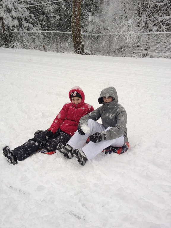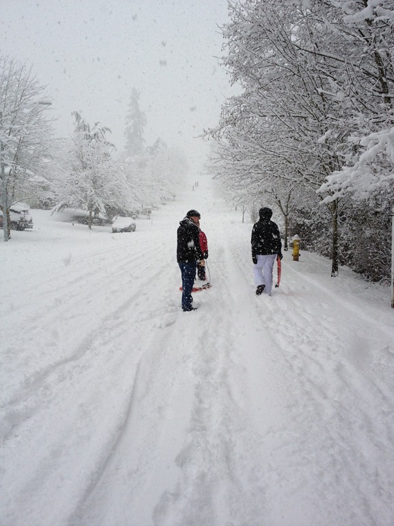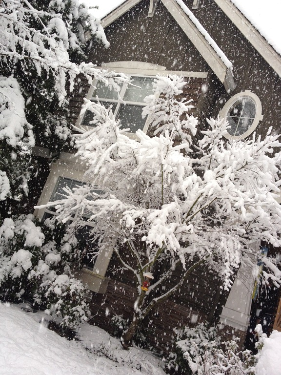 till Redmond. Jag tror att vi hade turen att få mest här omkring. Livet blir så mycket ljusare och himlen får en ovanligt blå färg. När vi vaknade i morse låg snön kvar och mer har börjat dala ner. Det börjar närma sig 20 cm av fluff. Och barnen hoppas på snödagar i skolan.