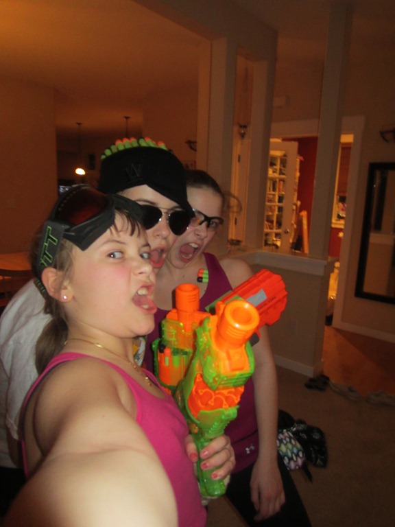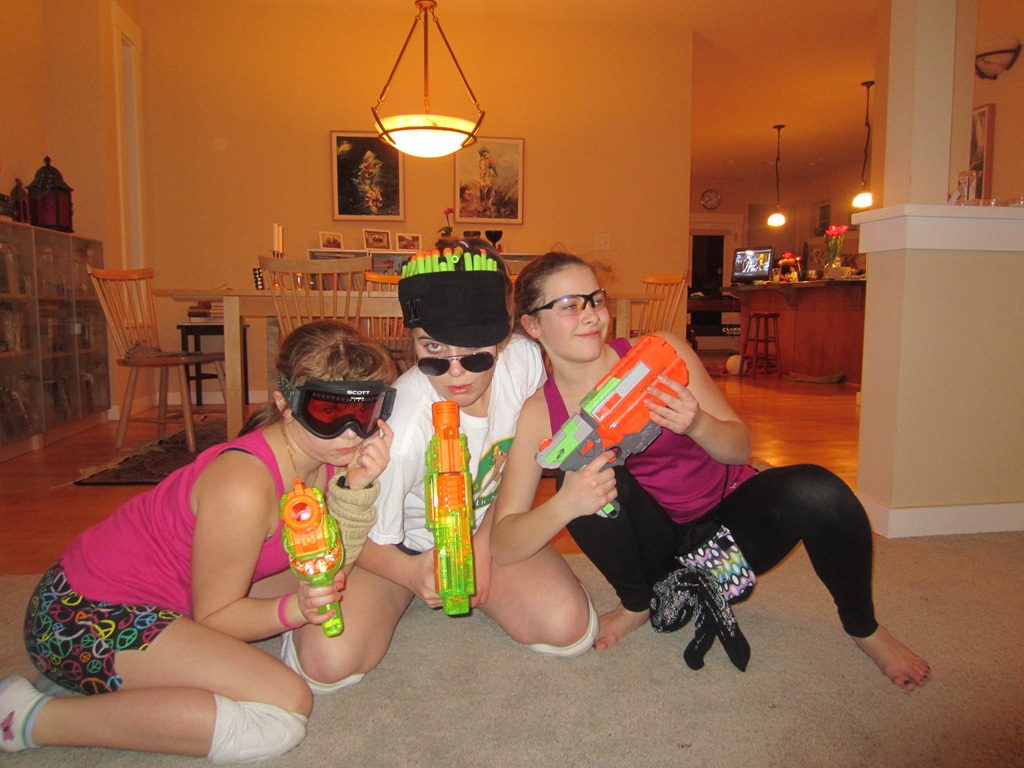 Som tur var så var det Martin Luther King Jr Day igår och vi hade ledigt från skolan. Ledigt från skolan betyder ju lite läxor men även lite fritid. Det var stor nerf fight bakom hörnen. Idag är det blå knän och små bulor lite här och där. Mycket händer när föräldrarna inte hemma. Lite 80-tals tema med snygga färger, benvärmare och skidglasögon… Nerf / Fame känsla. Bra att volleyboll knäskydden kommer till använding även när träningen är inställd pga snö.