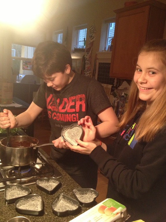 Nu har jag tagit en paus från matlagandet. Allt är förberett och ska bara avslutas innan Johanna och Brjann kommer från träningen. Smådamerna och jag har gjort oss till lite extra idag för att fira alla hjärtan. Jag har gjort skagenröra som står till sig i kylen som sedan ska serveras på lättrostad baguette. Vi har också en magisk köttbit som ska lätt fräsas med timjan och sedan få ligga till sig i ugnen. Sedan ska den toppas med en svamp-och lökfräs och en liten ros av parmaskinka. Till den serveras skivad och ungsrostad fingerlingpotatis (som det säkert finns ett svenskt namn på?) och små grönsaksgratänger. Tjejerna har bakat små hjärtformade kladdiga chokladkakor som det ska serveras kokosmjölk/yoghurtglass och blåbär till. De har också dukat fint och väntar nu otåligt på att få äta. Något resultat kan jag ju inte visa men processen är ju mer intressant. För nog är vi allt lite trötta på biler av mat på enorma, vita tallrikar.
