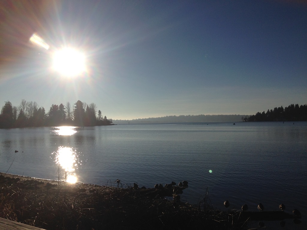 Strålande sol och pensionärer i klasar. Nu var det ju inte så att jag fotograferade några pensionärer som promenerade eftersom det kan ju verka lite smygigt. U-bryggan i Juanita var full av hundar, fotvandrare och cyklister. Man skulle ju nästan kunna tro att det är vår. Så här vackert var det när klockan närmade sig 16.30 på våra breddgrader.