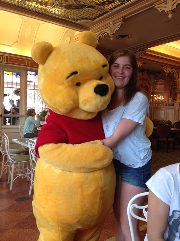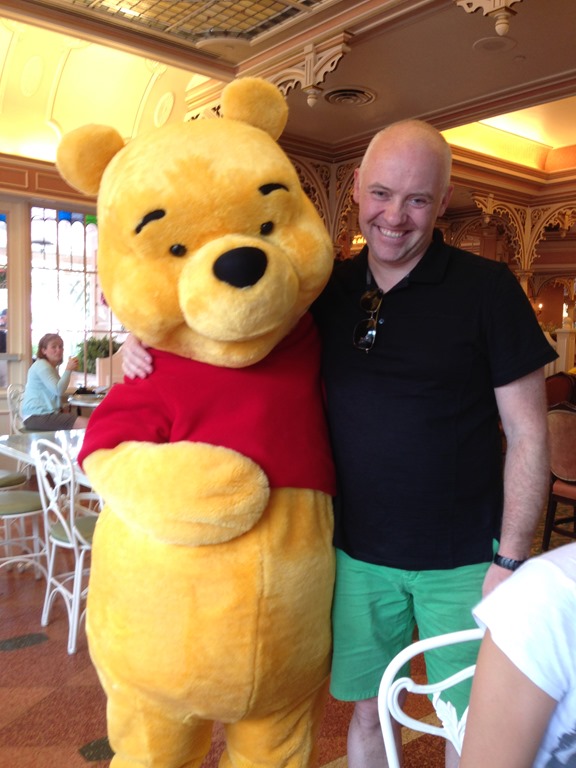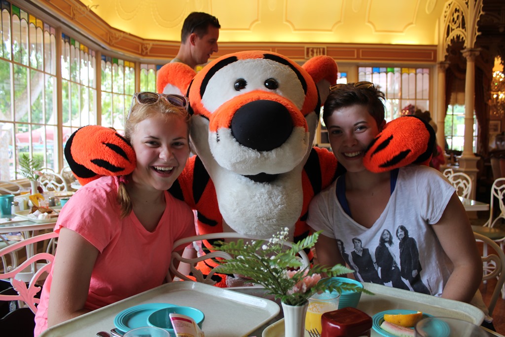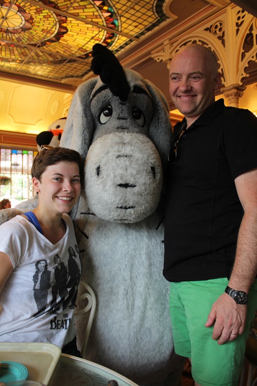 Maten var ju lite av ett problem för problemfamiljen. Glutenfritt verkar inte alls existera i Anaheim. Här omkring Seattle är vi otoligt lyckligt lottade och allt går att fixa när man går ut och äter. Det är inte heller läge att chansa när man är bortrest för vem vill spendera dagarna på toaletten eller akuten. Efter mycket sökande på diverse bloggar hittade jag ett glutenfritt alternativ för frukost inne på området. Vad jag inte hade läst på var att det var en frukosbuffe tillsammans med dina favoritfigurer i ullkostym. När vi fick höra summan av familjen fem trodde jag att vi hade köpt hela grisen som vi fick baconet ifrån. Men det var faktiskt värt det. Kocken kom ut och berättade vad som kunde ätas och vad man skulle passa sig för. Bacon tror man ju är 100% glutenfritt, eller hur. Nix. Man använder bröd för att suga upp fettet och ofta ligger baconet på brödet länge. Kocken kom ut med tre överfulla tallrikar med mussevåfflor, bacon och frukt. Piff och Puff, Nalle Puh och Kapten Krok tittade förbi under hela frukosten och ville inget hellre än tt hänga med familjen Brekkan. Jamenar, vem vill ju inte det. Vi var ju den enda familjen med barn över 5 år.