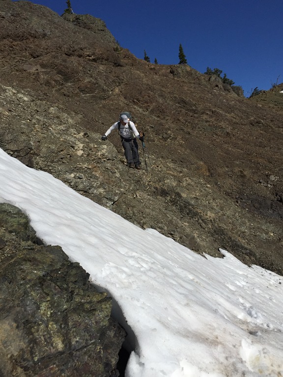 We walked and scrambled for a few hours and moved west over the ridge following goat tracks. It was a bit sketchy and tricky from time to time. A lot of ice/snow and loose rocks. Robin is a lot more confident and faster than I am and sliding around on the mountain edge with a heavy pack is not really my cup of tea.