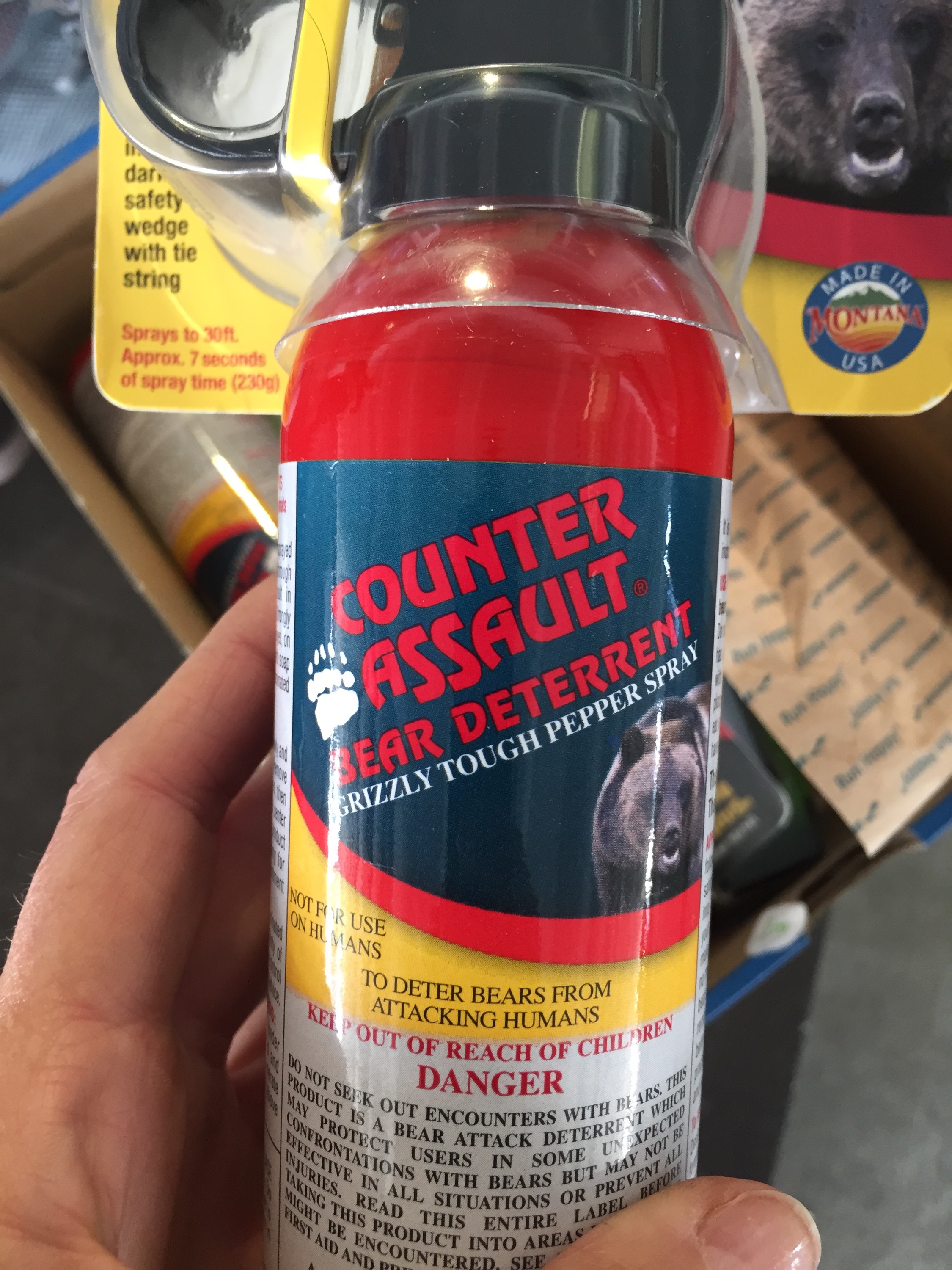 Vi hämtar också upp björnsprej och insekts sprej som ska kunna ta död på mygg stora som svalor eller örnar, cykelpump och lite annat smått och nödvändigt.