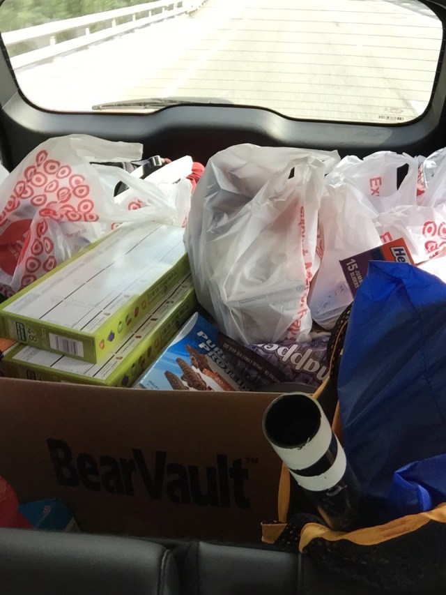Efter 8 timmars shopping och matintag har vi hyrbilen full med konserver och allmän skräpmat som klarar sig ute i rabarbern.
